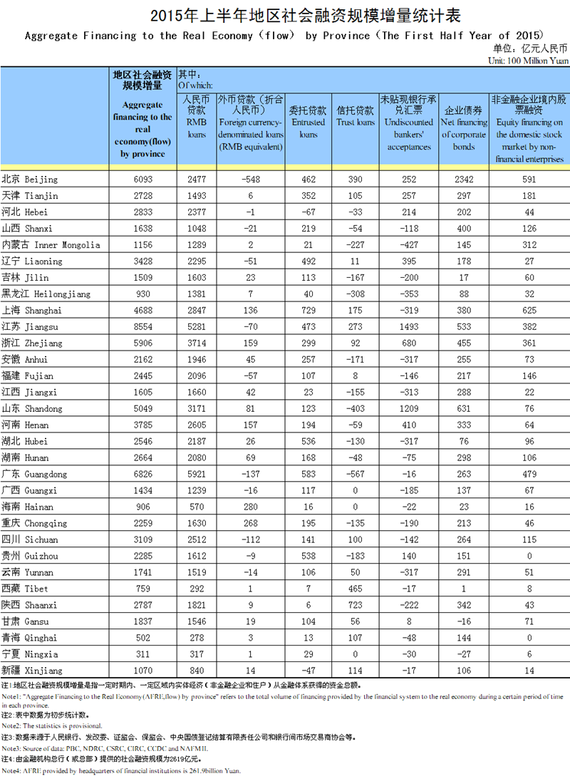 2015年上半年地区社会融资规模增量统计数据
