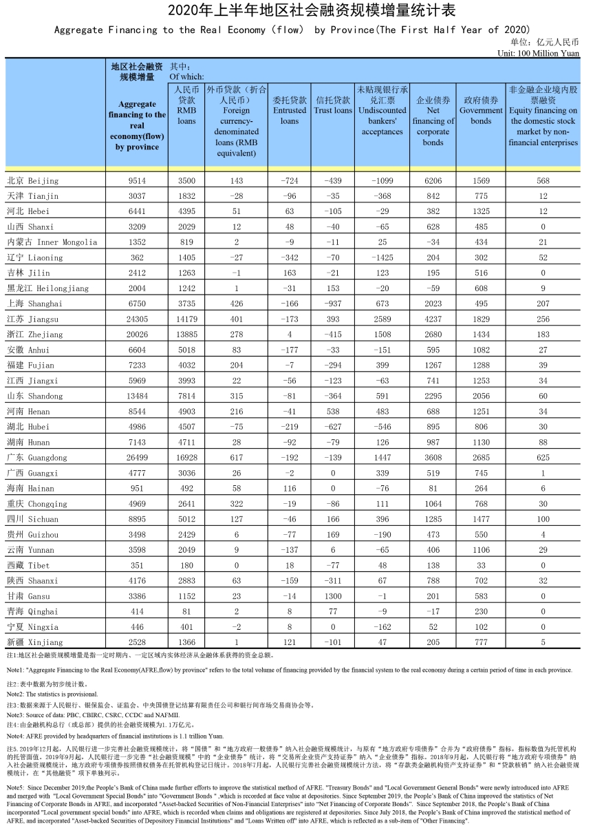 2020年上半年地区社会融资规模增量统计表