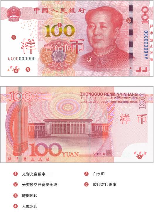 2015年版第五套人民币100元纸币规格、主图案、主色调、“中国人民银行”行名、国徽、盲文面额标记、汉语拼音行名、民族文字等要素,雕刻凹印、白水印等防伪特征,均与2005年版第五套人民币100元纸币相同。