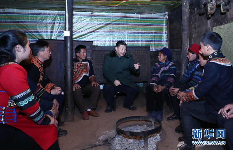 这是2月11日上午,习近平在凉山彝族自治州昭觉县三岔河乡三河村节列俄阿木家中同村民代表、驻村扶贫工作队员围坐火塘边,共谋精准脱贫之策。新华社记者 鞠鹏 摄